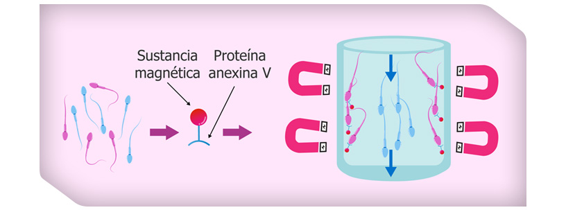 Magnetic-activated cell sorting (MACS): Con el propósito de seleccionar mejores poblaciones espermáticas se han desarrollado nuevas alternativas terapéuticas, como la selección de espermatozoides por microesferas magnéticas o MACS por sus siglas en inglés (Magnetic-activated cell sorting). Esta técnica de preparación espermática utiliza microesferas magnéticas conjugadas con moléculas de anexina V para separar los espermatozoides que están muriendo y por tanto tienen baja calidad funcional y reproductiva.