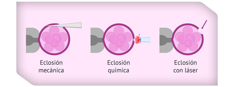 Eclosión asistida / Assisted hatching: El hatching asistido es una técnica empleada en el laboratorio que consiste en realizar un pequeño orificio en la membrana que rodea al embrión, la zona pelúcida, con el objetivo de que le sea más fácil desprenderse de ella (hecho que de forma natural es necesario que ocurra) y así poder implantar en el útero materno.